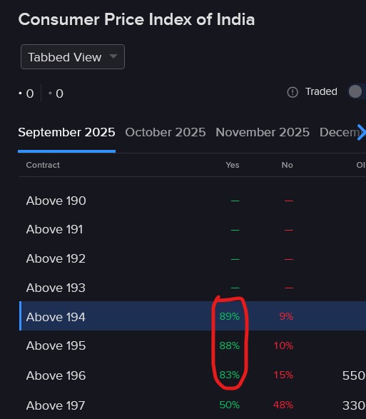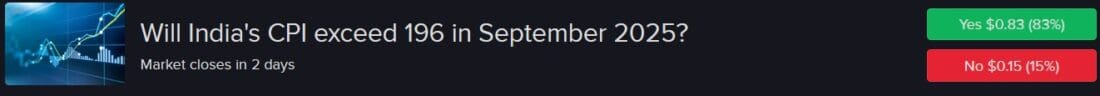 India’s index CPI value is expected to rise to 197.5 from 197 according to the median estimate consisting of 38 forecasters participating in the Reuters monthly poll for September. But the range of potential outcomes is particularly wide, amidst a minimum projection of 196.53 and a maximum of 200.61. Against this backdrop and my analysis that doesn’t support a 0.5% month-over-month drop, I find the risk reward profiles of the “Yes” answers at 194, 195 and 196 attractive. They’re going for $0.89, $0.88 and $0.83.