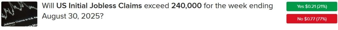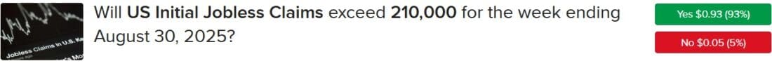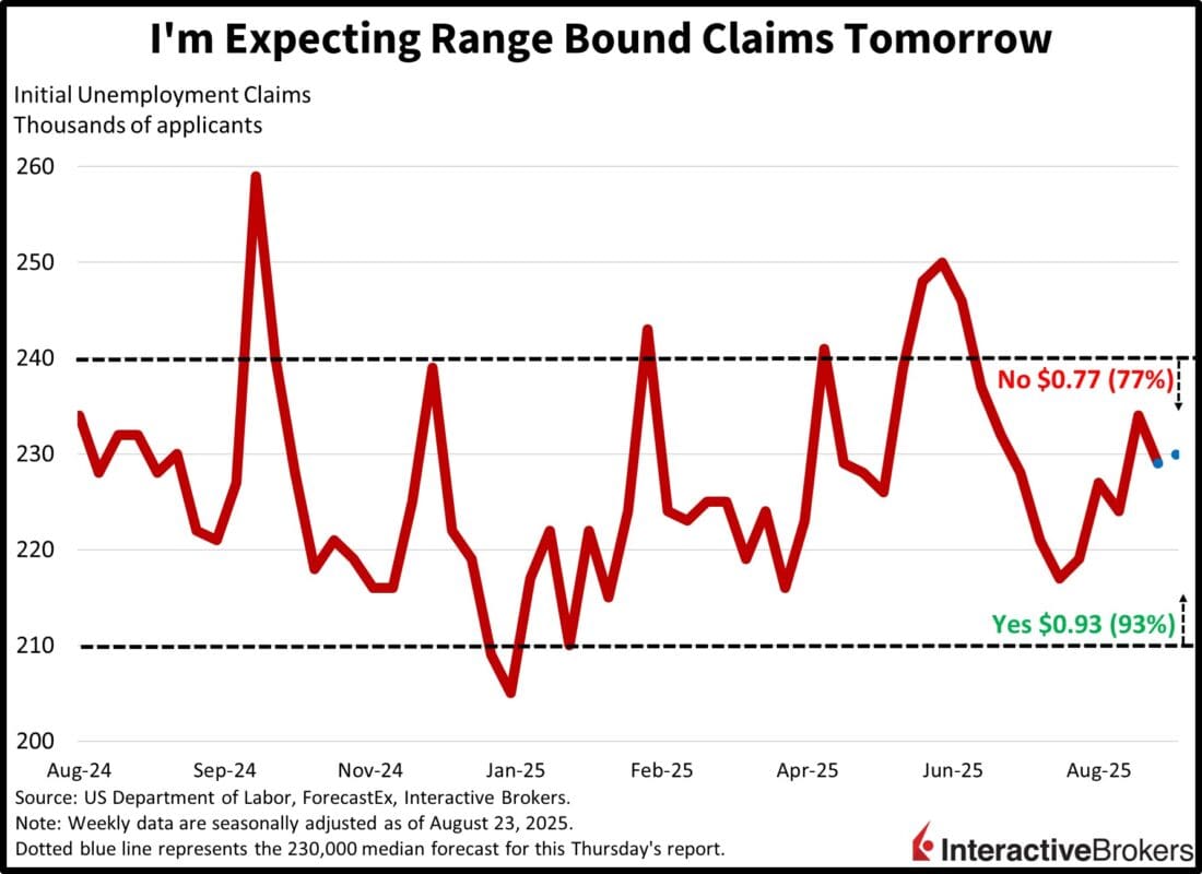 The labor market has been stabilizing as of mid-July, according to real-time indicators and the initial unemployment claims gauge has been neutralizing as a result. I’m expecting tomorrow’s print to remain range-bound with a bias to the downside, which is why I’m avoiding the 220k threshold in today’s forecast trade idea. I don’t envision a climb above 240k or a descent to the 210k area and my estimate is at 225k while the median is at 230k. Additionally, out of the 29 professional forecasters in the weekly Reuters poll, the minimum and maximum projections stand at 221k and 235k. Against this backdrop, I find the risk-reward profile of the “Yes/No” combination at 210k and 240k attractive since it costs $1.70 with a max risk of $0.70, as one of the sides is mathematically guaranteed to pay out $1.00. It’s profitable and pays out $2.00 on a figure as low as 211k or as high as 240k, an occurrence that has transpired for 10 consecutive weeks.