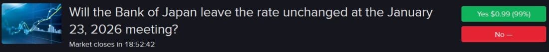 Participants are almost 100% sure that the Bank of Japan will not change its interest rate at the decision tomorrow.