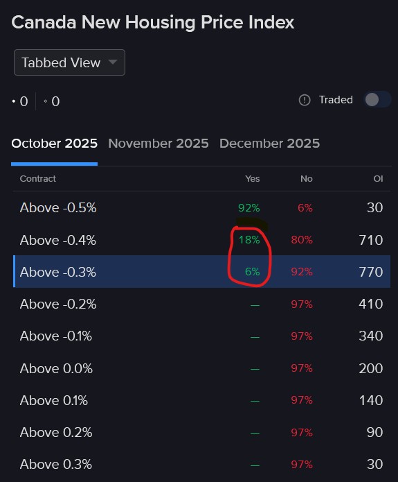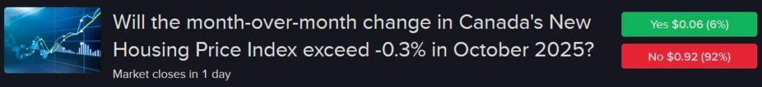 In the past 29 months going back to May 2023, Canada’s New Housing Price Index only failed to exceed -0.3% month over month (m/m) three times. Meanwhile the “Yes” contracts at -0.3% and -0.4% are priced at just $0.06 and $0.18 and are significantly undervalued considering that my estimates place fair values north of $0.25 for the former and ahead of $0.40 for the latter. Participants may be focusing on the recent weakness in the indicator, but even in this year of sluggish performance, it has arrived above the -0.3% threshold in 7 out of 9 occurrences. $0.06 is too cheap folks.