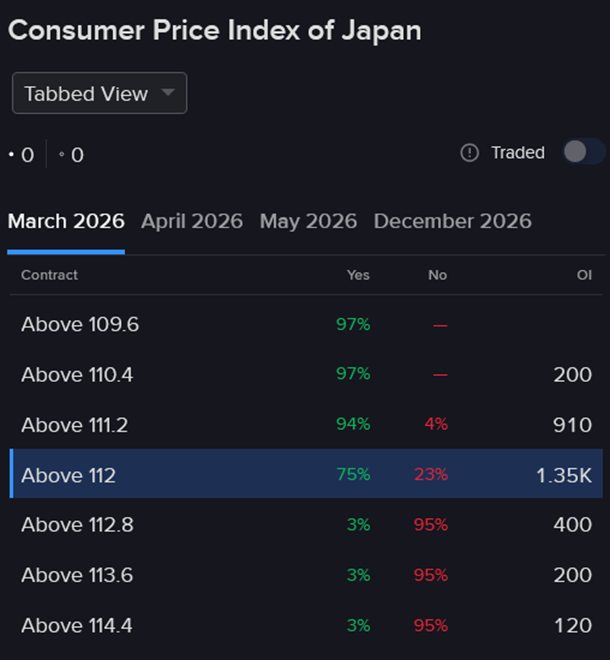 Japan’s March CPI, likewise, is also poised to increase due to higher energy costs. In February, the gauge fell from 112.9 in January to 112.1. Even if higher energy costs were offset by declines in the prices of other categories, it’s highly probable that the gauge will exceed the 112 threshold found in the Interactive Brokers prediction market contract that with a “Yes” answer that is priced at only $0.75. The prediction market also offers contracts with “Yes” answers that have thresholds of 112.8 and 113.6 that are both priced at $0.03.