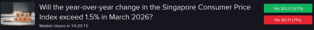 Also, this week, the Singapore CPI is expected to arrive near 1.8% after coming in at 1.3% in February, according to the median estimate of 19 forecasters surveyed by Reuters. The IBKR prediction market contract asking if the CPI will come in north of 1.5% has a “Yes” answer priced at only $0.27. With higher energy prices, the lowest and highest estimate among the 19 analysts polled by Reuters is 1.3% and 2.1%. A reading above 1.5%, in my view, is highly likely due to higher energy costs.