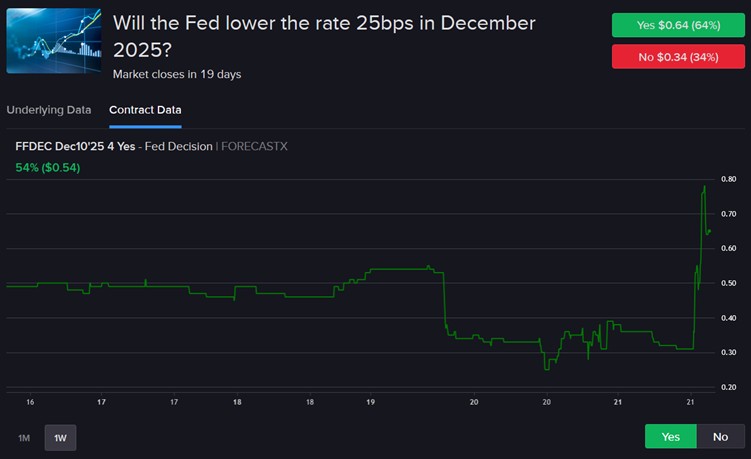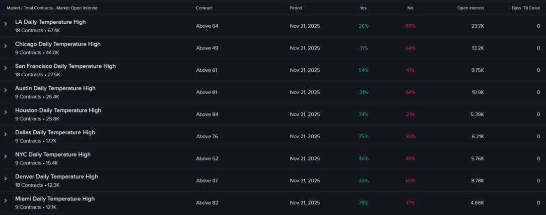 The contemporary addition of daily contracts to the ForecastEx platform asking whether the highest temperatures in certain major US cities will exceed particular Fahrenheit levels has gained huge popularity in recent days. Emblematic of this traction are north of 160k open contracts that are connected to today’s Nov. 21 expiry so far. The latest excitement has helped push volumes on the predictive platform above 1 million for the third consecutive day on this Friday. At the moment, settlements are available for Austin, Chicago, Dallas, Denver, Houston, Los Angeles, Miami, New York City, San Francisco and Seattle. But it hasn’t been just climate topics that ForecastTraders have been engaging heavily with lately, as there’s been significant interest tied to the Fed’s December rate decision, which political party will gain majority control of the House of Representatives in the 2026 midterm elections, the US Consumer Price Index (CPI) and the performances of Bitcoin and Ethereum as well as S&P 500 and Nasdaq 100 futures.