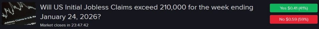 The last four weeks of initial unemployment claims have featured figures of 200k, 207k, 199k and 200k, substantially beneath the 52-week average of 225k. Filings are likely to drift north toward the annual mean once the December and January holiday effects are behind us as is typical in the post-pandemic era, however, participants price a figure below 210k in tomorrow’s print with a 59% degree of certainty. Meanwhile, we’ve only failed to exceed 190k one time in the past six years and in just 33 occurrences in the 3,081 observations going all the way back to 1967. Indeed, the 98.93% historical probability of getting a number above 190k make the “Yeses” at 180k and 190k especially compelling. Those are undervalued in my opinion and are going for $0.94 and $0.84.