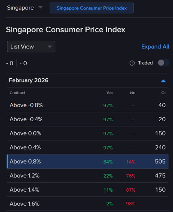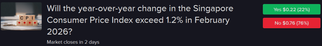 Forecasters expect Singapore’s Consumer Price Index (CPI) to come in around 1.1% year over year (y/y) this Monday, assigning 84% odds of a number exceeding 0.8% and a 76% probability that the result won’t arrive ahead of 1.2%. But there could be a potential opportunity for “Team Yes” at either threshold, as the monthly Reuters poll of nine economists sports an expected median of 1.3% against the backdrop of minimum and maximum values of 1.1% and 1.5%.