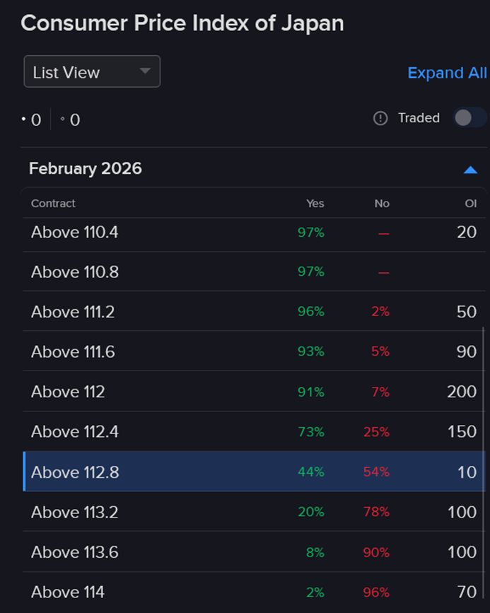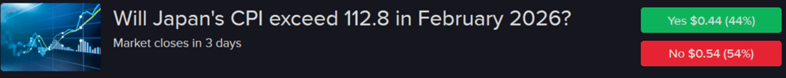 Japan’s CPI is expected to land at around 112.8, which would mark a 1.8% y/y climb from February 2025’s index value of 110.8. The odds of a number north of 112.8 are 44%, while a figure that fails to exceed it is at 54%. Meanwhile, the “Yes” and “No” at the upper and lower levels are at 20% for the 113.2 statistic while 112.4 is at 25%. For context, this is a projection for a modest month-over-month drop since January’s print came in at 112.9.