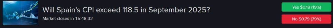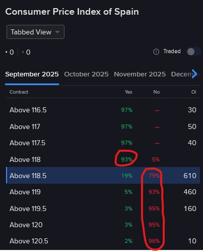 The preliminary release of September’s Consumer Price Index for Spain pointed to a 0.4% month-over-month drop alongside a 2.9% year-over year increase, which landed the index value at 118.345. In consideration of the indicator’s subdued deviation rate, the final release tomorrow, which is what our forecast contracts are tied to for this specific gauge, is likely to come in at 118.3 or 118.4, while 118.2 or 118.5 would be significant surprises. For this reason, I find the risk-reward profiles of the “Nos” from 118.5 to 120.5 attractive, which are ranging in cost from $0.79 to $0.96. The “Yes” at 118 also appears safe in my opinion at $0.93.