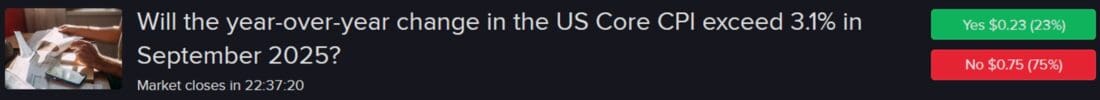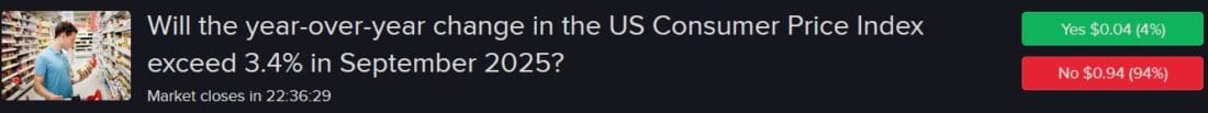 My September forecasts for the overall and core US CPIs are both at 3% and I think there’s very little likelihood that they will exceed 3.1% and 3.4%, which are the available thresholds above my expectations. Of the 35 forecasters surveyed in the monthly Reuters poll, none anticipate a number north of those two levels. Despite the government shutdown and these numbers not being released tomorrow, the “Nos” at 3.1% for core and 3.4% on headline are significantly undervalued at $0.75 and $0.94. Finally, this indicator also carries a subdued deviation rate, meaning that it tends to arrive near projections.