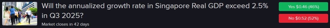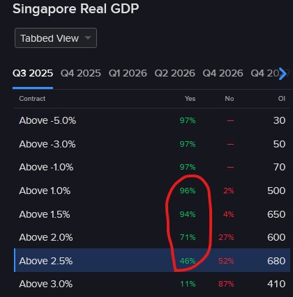 Singapore’s GDP revisions have been historically modest, and today’s 2.9% preliminary growth rate offer sours prediction market participants an opportunity to buy “Yeses” below that level. Indeed, the absolute average and median adjustments since fourth quarter 2005 have been 0.6 and 0.3. Against this backdrop I find the risk-reward profiles of the “Yeses” at 1%, 1.5%, 2% and 2.5% attractive. They range from $0.96 to $0.46 in cost. The 2% and 2.5% levels are especially undervalued, in my opinion.