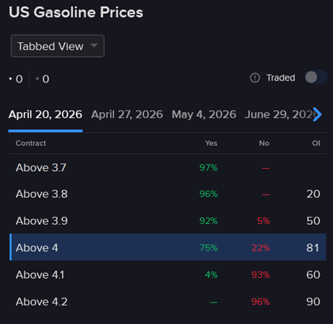 The first weekly drop in retail gasoline prices since the seven-day period ended Jan. 11 is likely to be published tomorrow morning with a heavy degree of certainty. The $4.123 reported last Tuesday is probably heading to a decline to $4.10 or under, as the “No” tied to the latter figure is going for $0.93 in the Interactive Brokers prediction market. But costs are still elevated from a historical standpoint, as the Middle East conflict and the associated closure of the Strait of Hormuz continue to disrupt critical energy flows. Indeed, the $4.00 “Yes” is at $0.75, with the result poised to arrive around $4.04 or so. Additionally, the $3.90 “Yes” is priced at $0.92, as a plunge of that magnitude just isn’t in the cards when analyzing the correlated crude oil and gasoline futures markets.