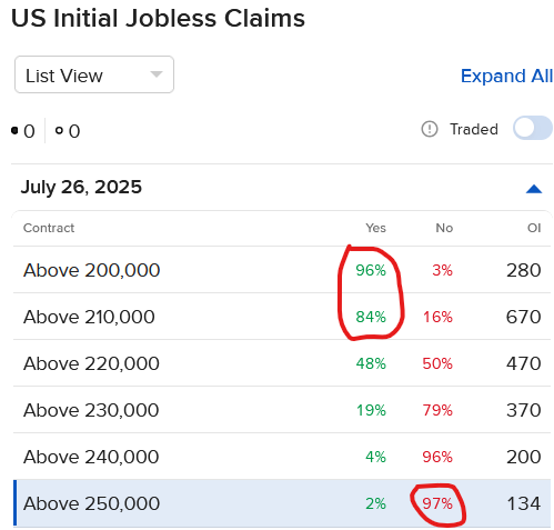 Note: Prices are highest bids as of the morning of July 25, 2025. Red circles around the thresholds were inserted by J. Torres to highlight his preferred “Yes” and “No” answers throughout different levels.