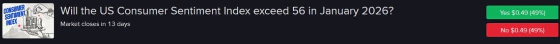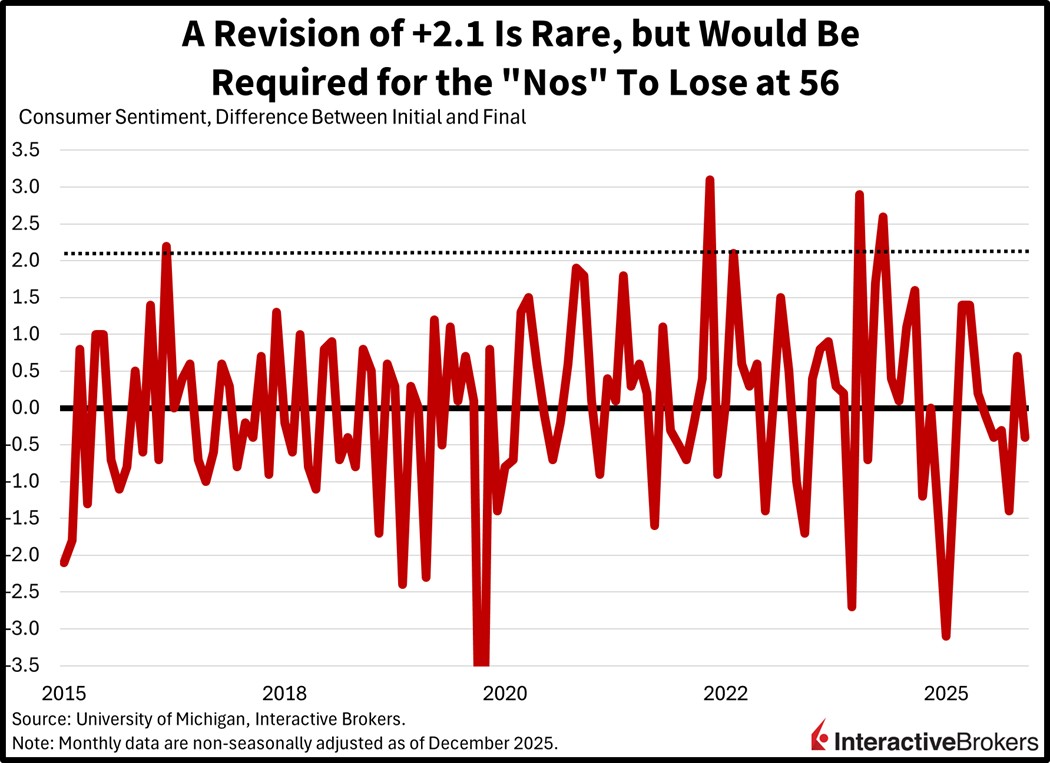 There’s a very low chance that this morning’s consumer sentiment print will be revised by +2.1 from 54 to 56.1 or higher when the final print is released two weeks from today. In the last 12 years, a revision of that magnitude has only happened a handful of times (please see chart below) and against that backdrop, the “No” at 56 is significantly undervalued at $0.49 in my view and should cost closer to $0.98.