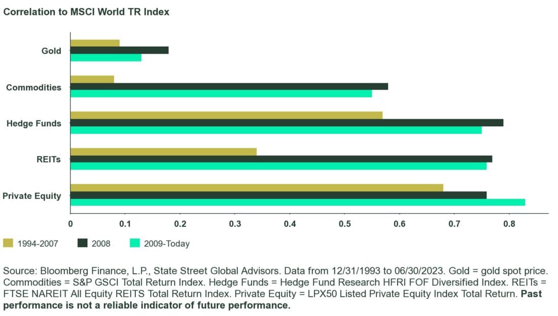 3Bloomberg Finance, L.P., State Street Global Advisors. Data from 12/31/93 to 06/30/2023. Gold = gold spot price. Commodities = S&P GSCI Total Return Index, REITs = FTSE NAREIT All Equity REITS Total Return Index. Past performance is not a reliable indicator of future performance.