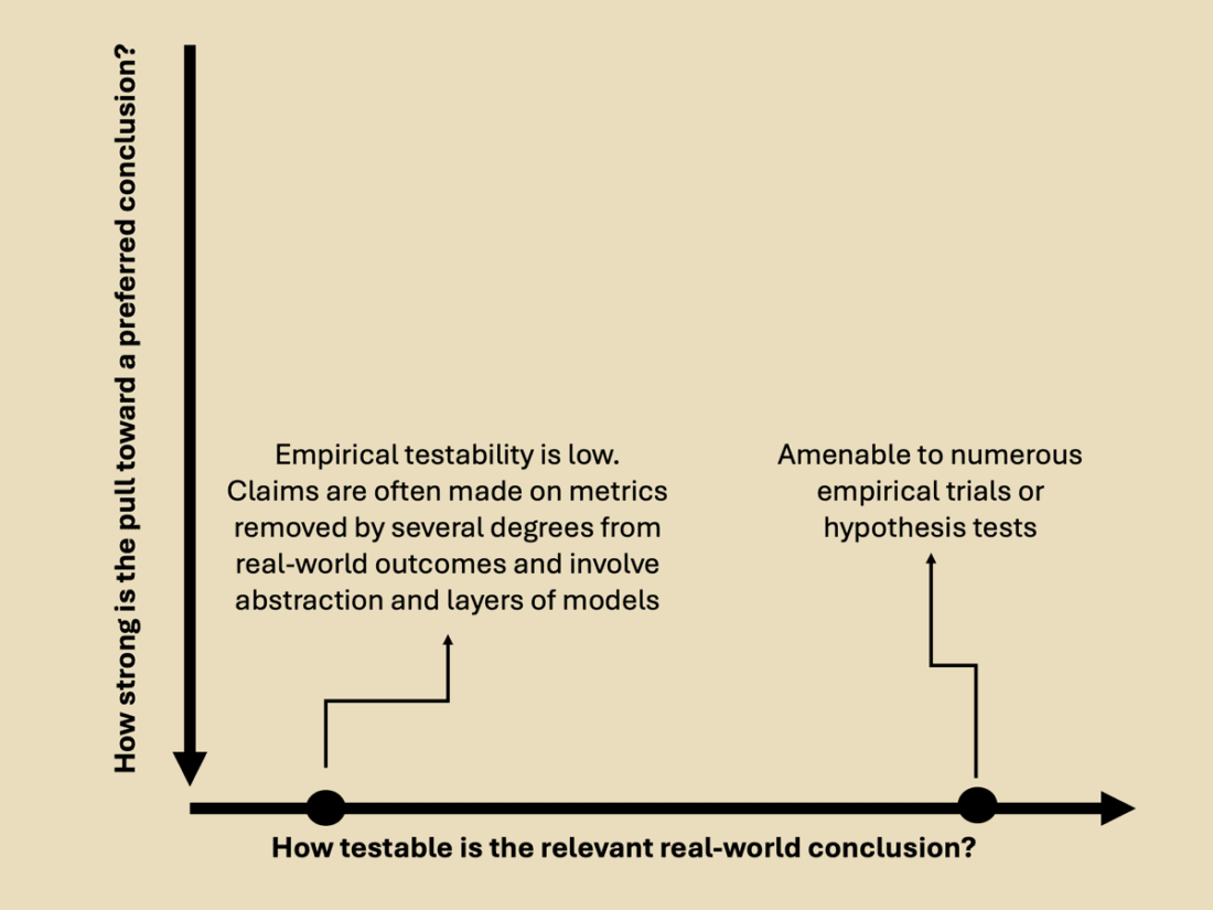 Below, I put “How testable is the relevant real-world conclusion?” on the horizontal axis.