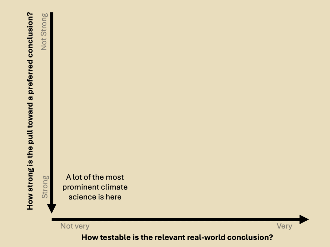 As a climate scientist by training, I pay close attention to climate science, and I have noticed that much of the field’s most prominent research and messaging tends to be highly susceptible to preferred conclusions and has low testability. Often, this is because the claims are inherently political, making them relatively easy to identify as native to Quadrant IV.
