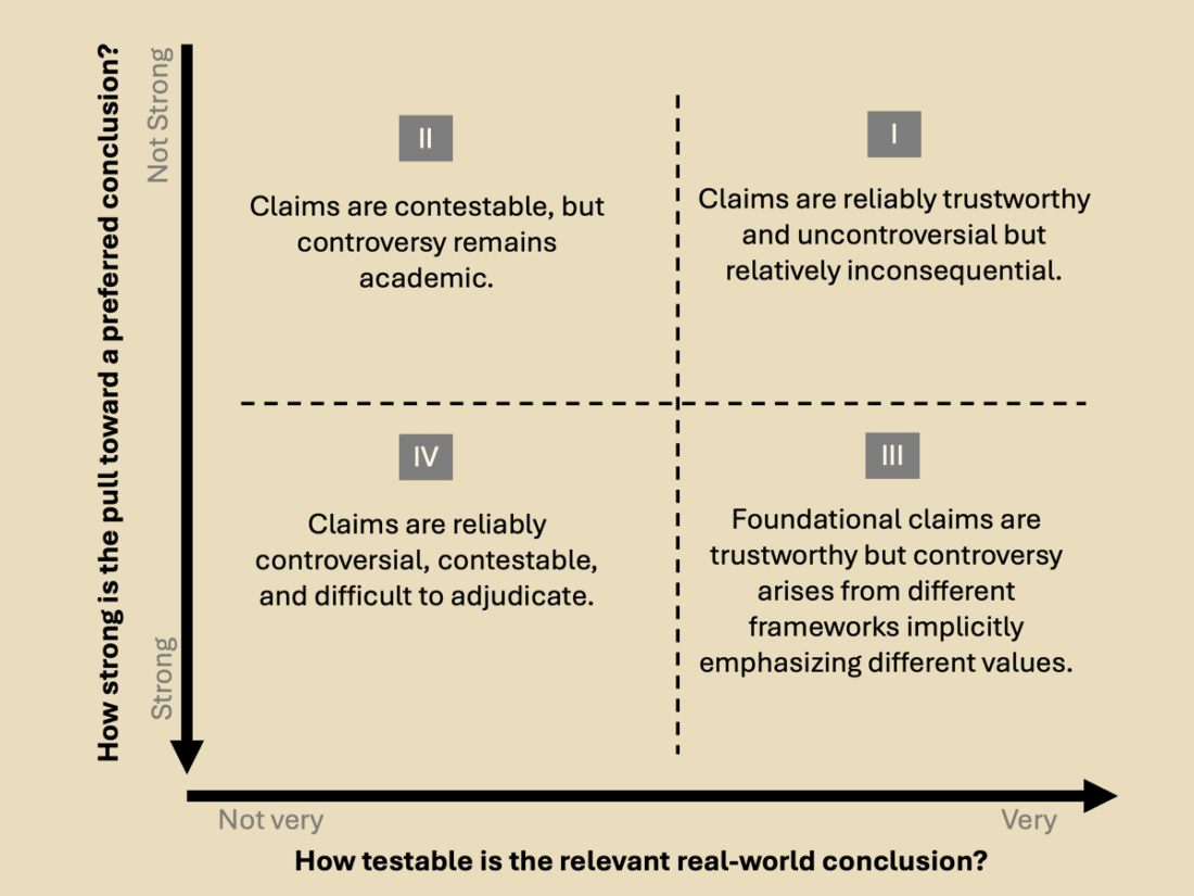 Quadrant III: Foundational claims are trustworthy, but controversy arises from different frameworks implicitly emphasizing different values.