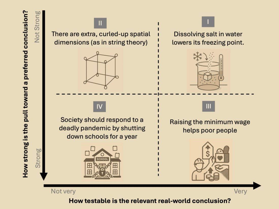 Examples in Quadrant I include the science facts that students learn and practice demonstrating in grade school, such as how dissolving salt in water lowers the freezing point of the water. Such a claim can be demonstrated quickly and easily anywhere, and it has no broader social ramifications or bearing on one’s career, identity, or beliefs.