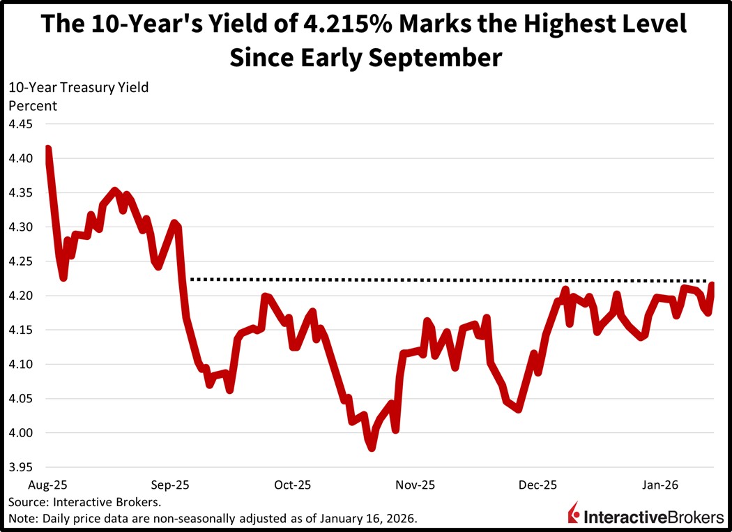 The 10-year yield jumped to a four-month high this morning as fixed-income watchers braced for potential geopolitical risk over the weekend in Tehran. A possible adverse impact of rising tensions is the threat of a reduction in energy supplies, which is sending oil prices and tightly correlated inflation expectations north. Another factor in consideration is soaring odds of former Fed Governor Kevin Warsh being nominated to the helm of the central bank after President Trump told National Economic Council Director Kevin Hassett that he’d prefer to keep him where he is. Warsh, meanwhile, is perceived as increasingly likely to be influenced by the commander in chief rather than prioritizing the monetary policy authority’s independence, and that too is lifting interest rates, particularly at the long-end as the curve ascends in bear-steepening fashion. Additionally weighing on Treasury performance is the head of state threatening new tariffs to nations that don’t go along with Washington’s quest to acquire Greenland in the name of sovereign security, which is generating cost pressure and military spending uncertainties, raising term premiums as a result. The economic calendar was mixed though, as a big beat on industrial production coincided with an enormous miss on homebuilder sentiment. Elsewhere, stocks are near their flatlines, commodities are mostly lower and Bitcoin and Ethereum are down. Forecast contracts, however, are catching bids.