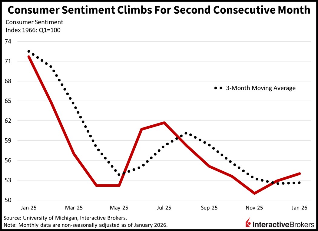 Consumer sentiment rose for the second consecutive month and climbed to its strongest level since September, according to the University of Michigan (UMich). Households feel better about economic opportunities, although high prices and a lack of employment possibilities tempered gains. The improvement was reflected in a headline January score of 54, above December’s 52.9 and the median estimate of 53.5. The sub-indices of current conditions and future expectations increased from 50.4 and 54.6 to 52.4 and 55. Meanwhile,12-month inflation forecasts remained unchanged at 4.2% but the anticipated rate over five years advanced from 3.2% to 3.4%.