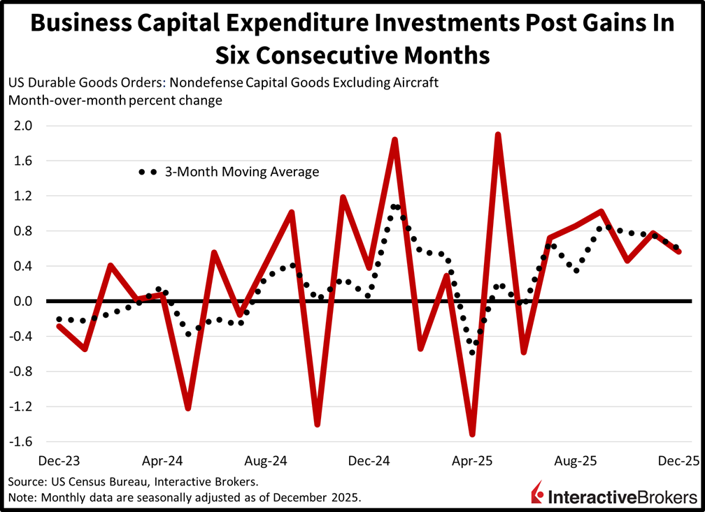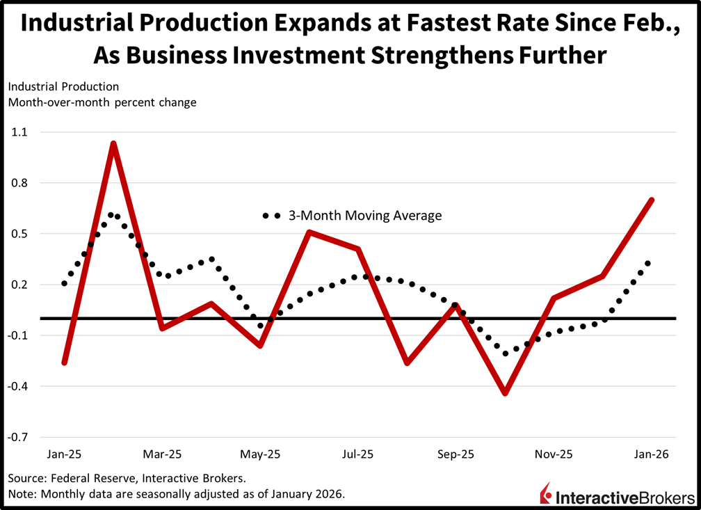 Industrial production grew at its strongest monthly pace since February 2025 to begin the year as capital expenditure incentives from the Big Beautiful Bill are poised to continue bolstering factory activity this year. The 0.7% month-over-month (m/m) increase arrived much stronger than the 0.4% expected and the 0.2% recorded in December. Amongst the major industries, utilities and manufacturing expanded by 2.1% and 0.6% while mining experienced a 0.2% m/m contraction. Across market groups, business equipment, nonindustrial supplies, consumer goods, materials and construction saw output rise 0.9%,0.9%, 0.7%, 0.6% and 0.5% m/m.