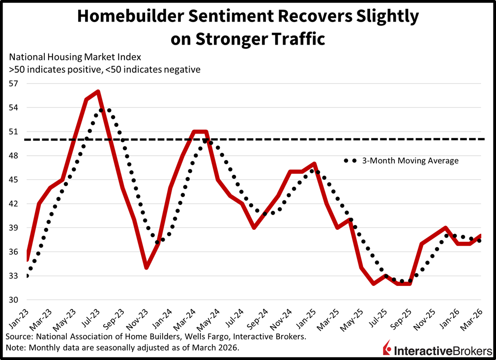 Homebuilder sentiment improved slightly this month on broad progress across categories even though the result remained extremely weak by historical standards. The NAHB/Wells Fargo headline index of 38 was modestly above the 37 expected, which would have been the same figure from February. The current sales, transaction outlook, and prospective buyer traffic components all rose, climbing from 41, 47 and 22 to 42, 49 and 25. Throughout regions, the Midwest and South experienced increases of 5 and 1 to land at 47 and 36, offsetting the 1-point drop in the Northeast, which placed the region at 42. The West arrived unchanged, meanwhile, at 30, which printed well below the positive-negative threshold of 50. Going under the hood, 37% of suppliers cut prices in March while the use of incentives was at 64%, compared to 36% and 65% from the prior period.