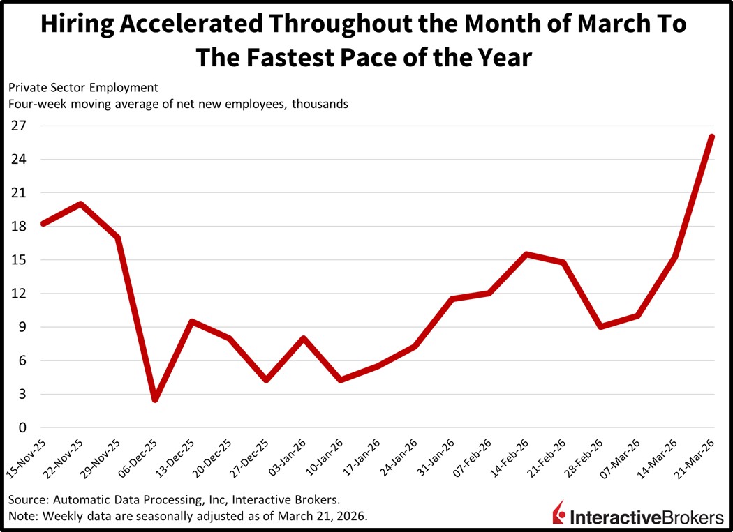 Private-sector payroll additions accelerated towards the end of last month to the fastest pace of the year as hiring momentum defies the substantial cyclical risk posed by the Middle East conflict. Worker rosters surged by an average of 26k workers in each of the four weeks during the period that ended March 21, north of the 15.25k print from the previous publication, according to ADP. The numbers bolstered confidence in the government’s latest jobs report. The key BLS indicator has experienced significant revisions in recent years but at 178k, Friday’s release flew past expectations while jumping to a 15-month high.