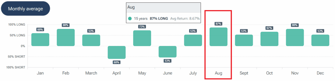 In 87% of the past 15 years, Nvidia shares gained in August, averaging an 8.67% monthly return. – Source: Forecaster Terminal