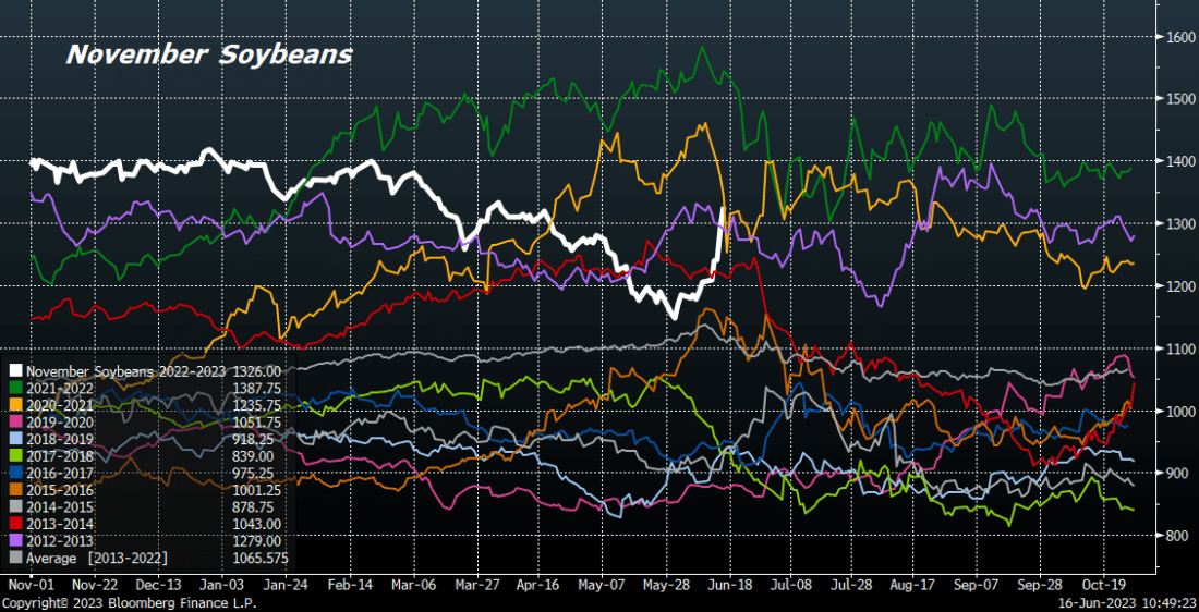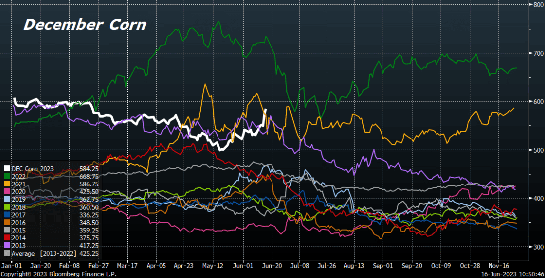 The crops are off to a very poor start, with crop conditions deteriorating last week in most states, and the top-producing states below last year and below the 10-year average. But while gains already forged may have been justified, the high level of uncertainty ahead could expand the potential buying interest to a point where the market overreacts, and prices become too lofty. In the past, rainfall totals and coverage have been hard to predict, but with the series of systems forecast and a possibility of seeing 9–10 days with no definitive hot and dry pattern in place, it could be difficult for the hot and dry conditions to return suddenly and convincingly. The bull case has been very strong, but it is open to challenge, and the market could see a major fork in the road in the coming week.