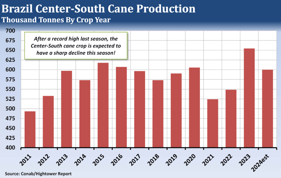 The first-half April Center-South cane-crush of 15.81 million tonnes was 14% above last year and may become a critical factor for sugar prices going forward. Despite the fast start, the dry conditions Brazil has experienced since late 2023 could lower yield as the season progresses. Recent trade forecasts have projected the 2024/25 cane crush to come in below 600 million tonnes versus 654 million last year.