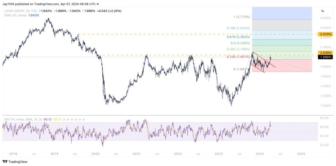 The 2-year yield appears to have formed a long-term cup and handle pattern and is now on the verge of breaking out of that pattern, with the potential for the rate to rise to around 5.1%. It may sound surprising to hear that the 2-year rate could rise this high from a fundamental basis, but let’s face facts, given the latest round of job data and expectations based on CPI swap pricing with the y/y rate expected to remain around 3.2% for the next few months, it would make sense for more rate cuts to be removed from market pricing, resulting in a higher 2-year rate.