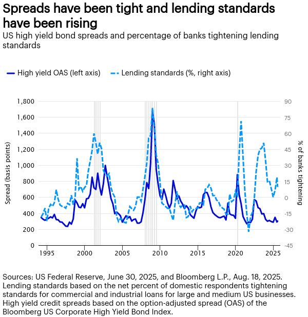 … the usual “canaries in the coal mine” for the US economy aren’t flapping, wheezing, or falling off their perch. (Apologies for the back-to-back animal metaphors.) A look at bank lending standards and credit spreads reveals little cause for alarm. Only 9.5% of senior loan officers report tightening standards, far below the 50%-60% levels typically seen during recessions.4 Meanwhile, high yield credit spreads are trading roughly 200 basis points below their long-term average,5 which suggests investors are confident enough in the economy to continue to lend money to businesses with below-investment grade ratings.