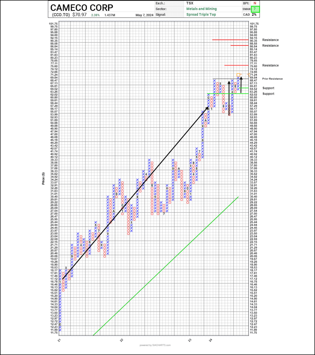 Outperformance often reflects improving investor expectations for strong company or sector growth. Uranium producer Cameco Corp. (CCO.TO) has been a relative outperformer among Canadian large caps, spending most of the last year in the Green Favored Zone of the SIA S&P/TSX 60 Index Report. In the winter, however, the shares dipped down into the red zone briefly as the shares staged a correction. About a month ago, CCO.TO returned to the Green Favored Zone and it has remained there since, finishing yesterday in 5th place. Since returning to the Green Favored Zone, CCO.TO is up 9.7% compared with a 3.8% return for the S&P/TSX Composite Index. The previous time Cameco was in the Green Favored Zone, from May 2023 to February 2024, it returned 46.8%, compared with 5.3% for the index over the same period. Three months of consolidation in Cameco Corp. (CCO.TO) shares ended yesterday as a breakaway gap up to a new all-time high put an exclamation point on six weeks of steady recovery. Yesterday’s breakout confirmed that Cameco’s long-term underlying uptrend has resumed and also completed a bullish Ascending Triangle pattern. The only other thing that would have been nice to see would have been a volume spike like the one in March when the current advance kicked off, but it’s not necessary since we had the earlier one. A measured move from the recent trading range suggests next potential resistance on trend may appear near $85.00. Initial support appears at the February low near $62.75.