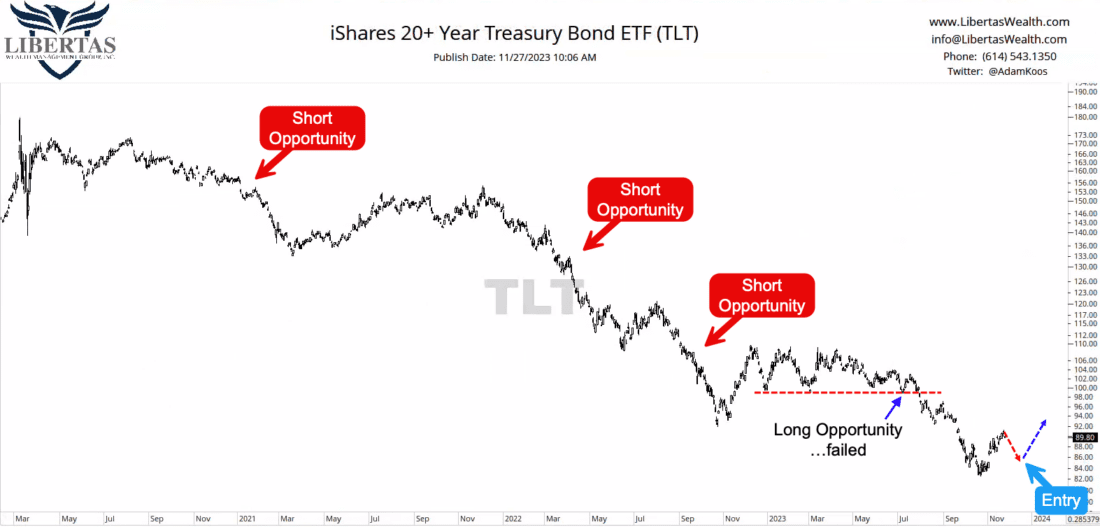That being said, there was also a good risk/reward opportunity this summer to go long bonds (in this case, TLT), but that trade failed… granted, the total loss (if using the red dashed line as a stop-loss) was extremely mild. Hence “good risk/reward opportunity.”