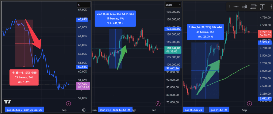 An example of this relationship could be seen this year between late June and mid-July. In the following chart, we can see how Bitcoin’s dominance fell from 65% to 60%, while the price of Bitcoin rose by 27%. In contrast, the price of Ethereum increased much more than Bitcoin’s, rising by 88% in this case. This usually happens in a bull market, when investors see greater upside potential in other coins than in Bitcoin. As a result, Bitcoin’s dominance falls while its price rises, which in turn makes the price of altcoins, in this case Ethereum, rise much more. Investors are seeking higher returns by taking on greater risk.