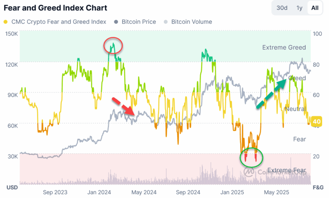 In the following chart, we can see that when the indicator is in extreme greed (dark green), the price of Bitcoin, shown in gray, falls (red arrow), and when the indicator is in extreme fear (red), the price of Bitcoin rises (green arrow):