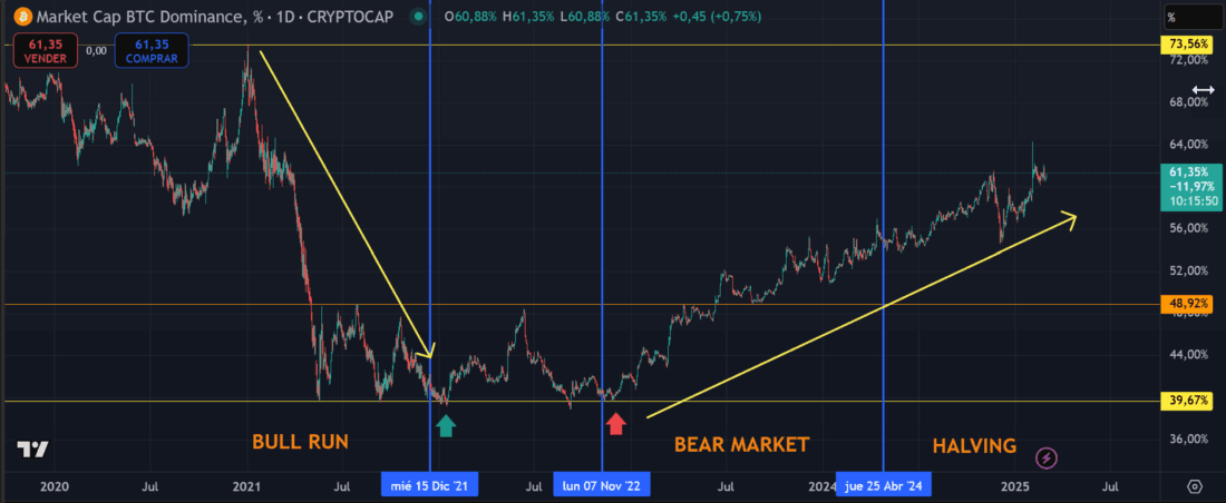 Bitcoin dominance tends to rise during bear markets and fall during bull markets. This is because, in a bear market, investors seek refuge in the most stable cryptocurrency, which is Bitcoin. In contrast, during a bull market, investors look for higher returns and are therefore willing to take on more risk, which leads them to invest in other cryptocurrencies besides Bitcoin. This relationship can be seen in the following chart of Bitcoin dominance:
