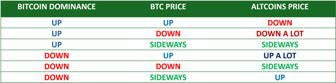 There is a close relationship between the price and dominance of Bitcoin versus the price of altcoins, which we will see in the following table. By definition, altcoins (alternative coins) are all cryptocurrencies other than Bitcoin. Some people also exclude Ethereum, but strictly speaking, Ethereum is also an altcoin.