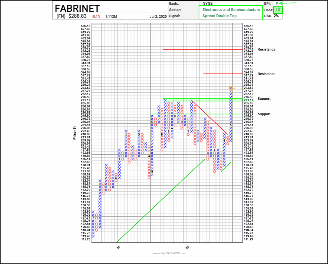 Turning next to the point and figure chart, we see this powerful move reflected in a column of X’s over the past two months, with shares pushing higher through former resistance, now support, at $245.60 dollars and then $271.17 dollars. Using point and figure vertical count analysis, SIA practitioners might identify potential resistance at $324.07 dollars and possibly higher at $379.70 dollars, based on prior consolidation levels. The latest point and figure signal is a spread double top, which has propelled the stock to new highs. This is especially notable in a market where many indexes appear to be brushing up against resistance, once again highlighting Fabrinet’s relative strength.
