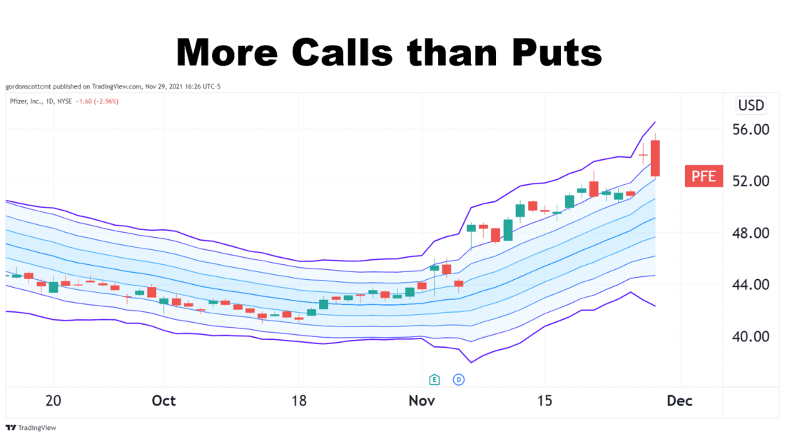 While Moderna (MRNA) shares are moving higher on the Omicron news, shares of fellow Covid treatment provider Pfizer (PFE) are slightly down today. Even with the small pullback, PFE shares are trading near the top of the volatility range, after having gapped up significantly on Friday.