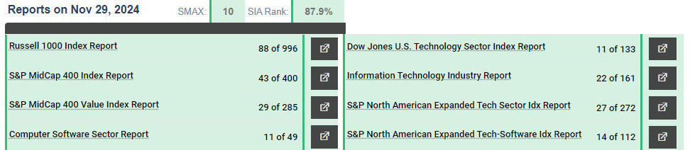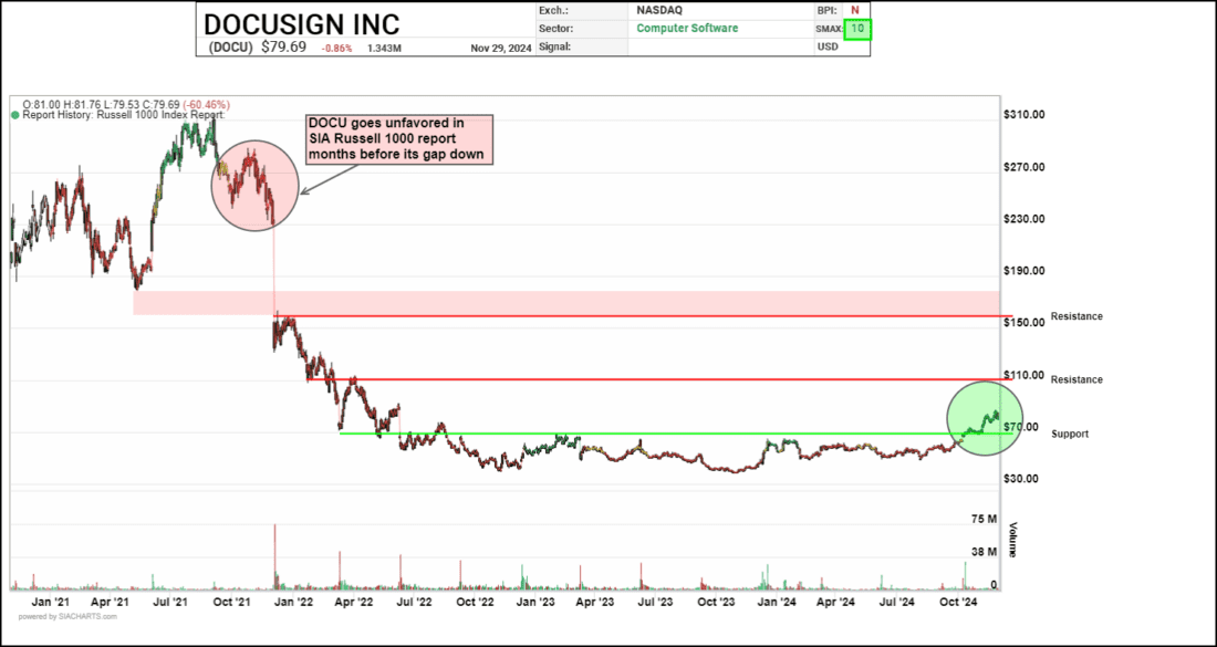 In the first attached daily candlestick chart, this gap down is visible on the far left of the chart, just below the red circle, which outlines the red candles that illustrate the position of DOCU shares within the SIA Russell 1000 Index Report prior to the massive selloff. According to SIA’s rules-based methodology, owning these shares would have been avoided, as only stocks in the upper zones of the SIA Reports are favored, while those in the Unfavored Red Zone, such as DOCU at the time, are avoided. The chart also shows the retracement of the share price into 2022, followed by a multi-year consolidation. However, last month, the shares appear to have perked up. The now-favored position of the shares within the SIA Russell 1000 Index Report is highlighted (see green circle), along with a full list of all reports where DOCU shares are a member. These reports show that DOCU shares are highly ranked and positioned in the Favored Green zones across all these reports.