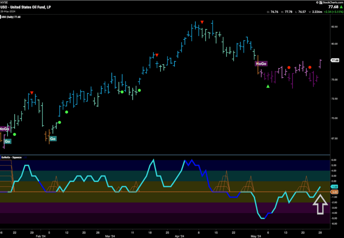 There are inflection points everywhere it seems! The U.S. oil fund fell out of its “Go” trend around a month ago and has been moving sideways in a “NoGo” trend since. Having failed to make a new lower low, price rallied yesterday.