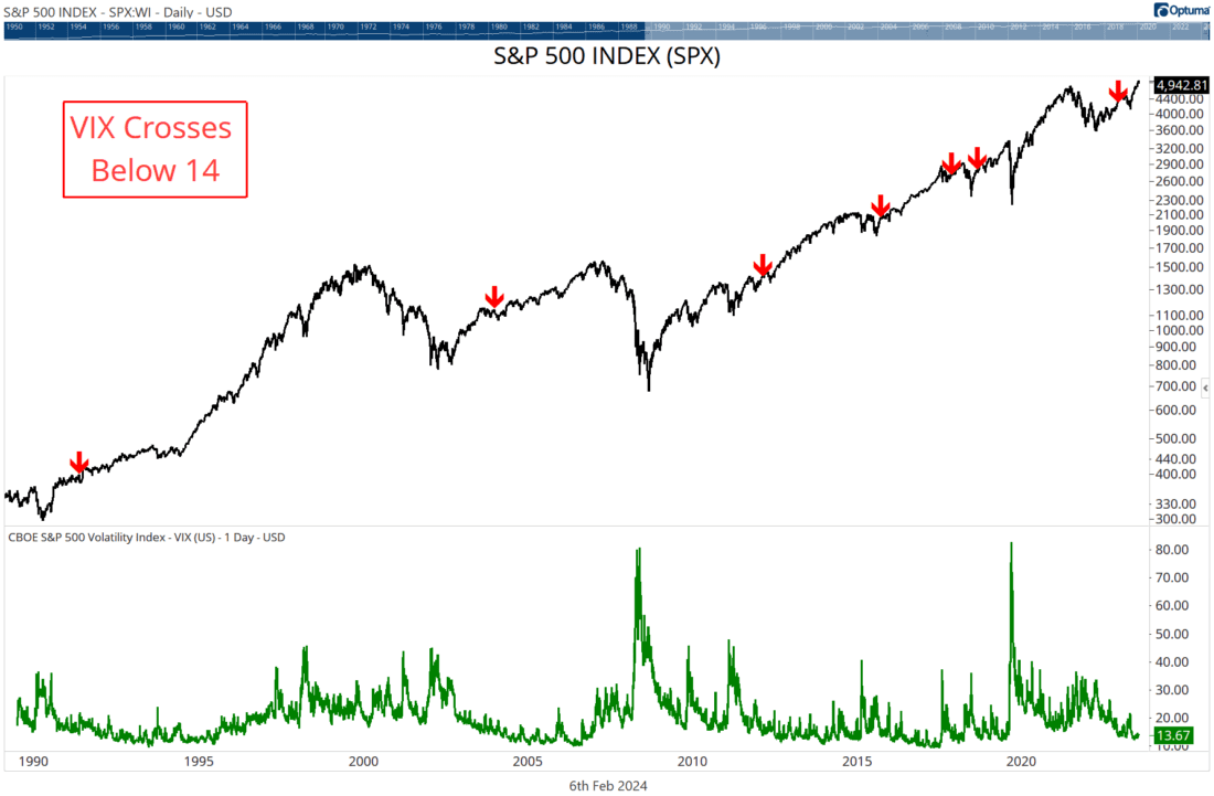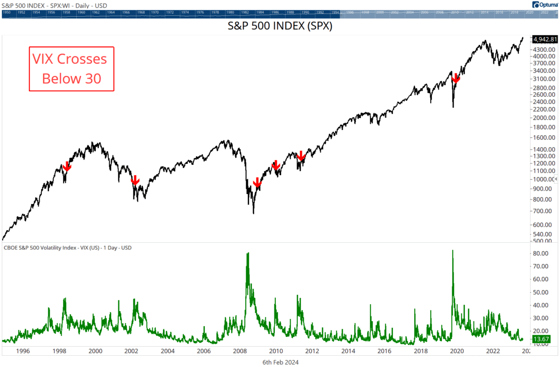 In Chart 2, I’ve added arrows to all the times that the VIX had been above 30 and then crossed below 14 for the first time. Just by looking at the chart you can see that it’s a nice signal that gives us confidence in the short-term outlook.