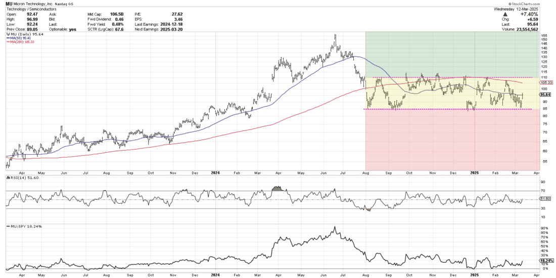 In this sort of situation, I tend to favor a stoplight approach based on the validated support and resistance levels. If MU can push to a new swing high above $110, that would suggest a potential retest of the 2024 high. A drop below support around $85 would confirm a new swing low and imply a high likelihood for much weaker price action going forward. In the meantime, given the well-established price range and anemic momentum readings, investors are perhaps best served by looking elsewhere for actionable opportunities.