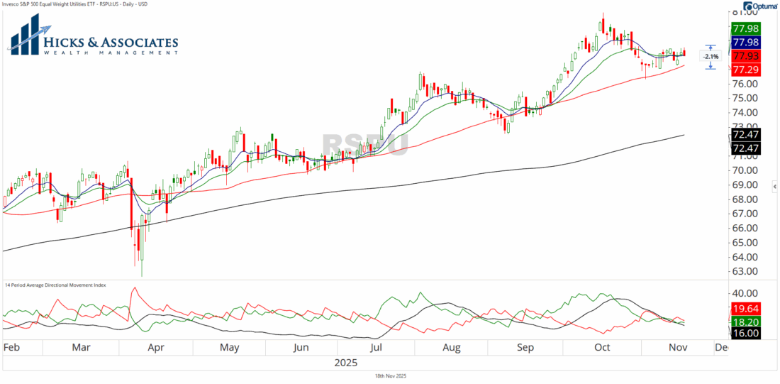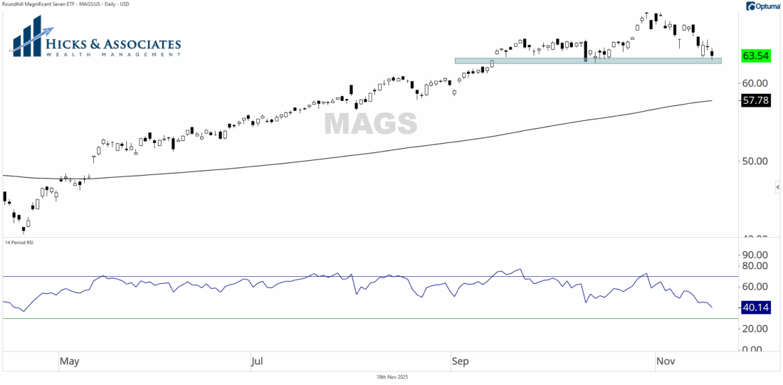 The first chart for today is MAGS, an equal-weight ETF that offers exposure to those top 7 stocks commonly referred to as the Magnificent 7. Considering the fact that ~50% of the S&P 500 is currently below their own 200-day moving average, we can say that ~50% of the S&P 500 is in a negative trend. Since the Mag7 has had such an outsized influence on the S&P 500’s performance, the support zone that I’ve highlighted on the chart really needs to hold. Unfortunately, RSI is not showing that it is “oversold” just yet.