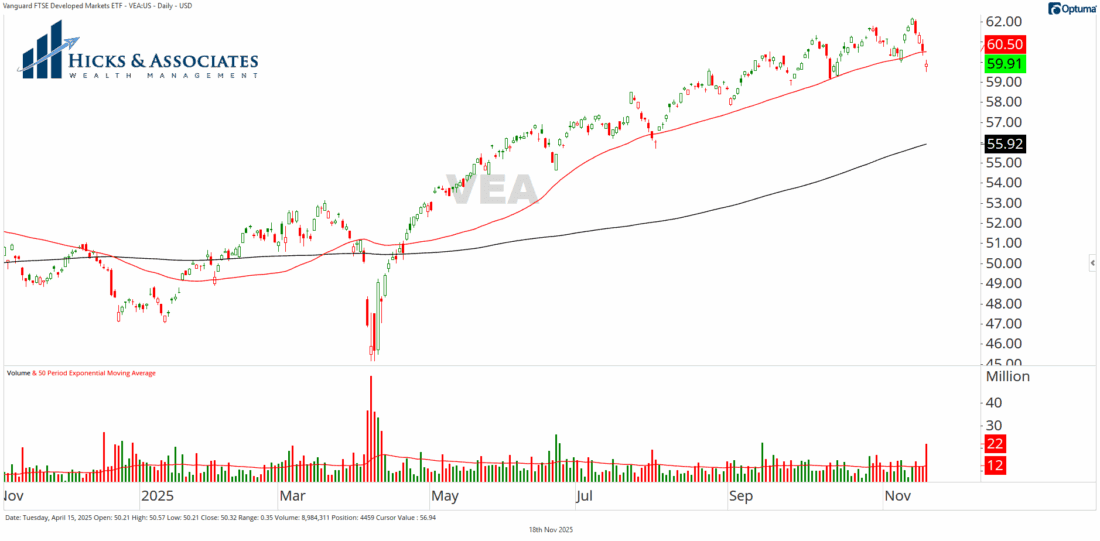 As I scanned through charts before writing this newsletter, VEA stood out. While it is not been the strongest sector, take a look at how it has hugged that 50-day moving average (red line). Unfortunately, VEA fell below that moving average / trendline on Wednesday … and, it did so on above average volume.