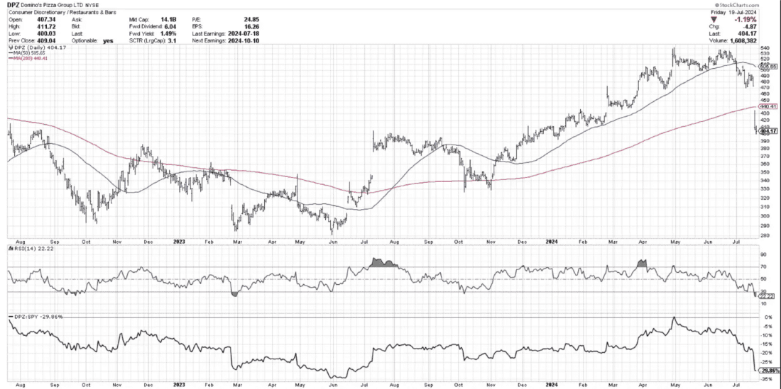 So, why focus on DPZ? Domino’s hit a peak in April this year, driven initially by what can be described as an “exhaustion gap.” After a remarkable run, the stock surged up one final time, much like a marathon runner gasping for that final breath at the finish line. Unfortunately, while we retested those April highs in June, we never actually moved higher. In fact, things started to fall apart in late June and early July. Domino’s ended up gapping lower this week, plummeting below its 200-day moving average, and dropping around 13.5% on Thursday alone.
