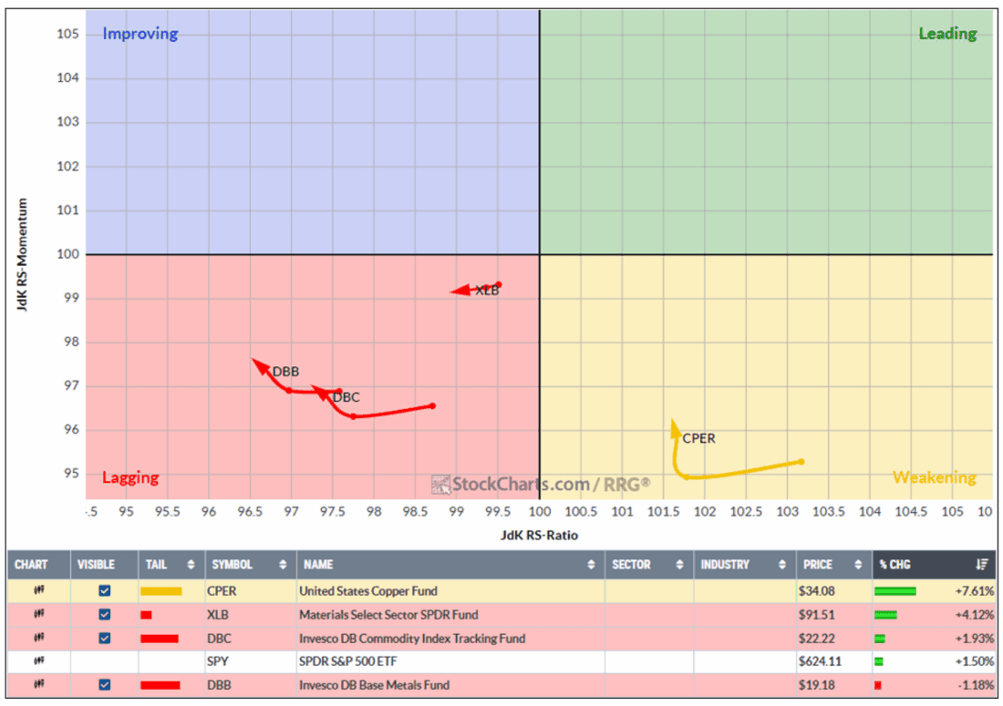 The shares of CPER are leading the Basic Materials sector, the broad Commodities index, the Base Metals index, and the S&P 500 index YTD. Its weekly RS-Ratio rotated into the weakening quadrant, but its RS-Momentum has since turned sharply higher and appears poised to rotate back into the leading quadrant over the next few weeks.