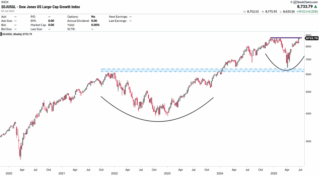 The Dow Jones US Large-Cap Growth Index ($DJUSGL) is pressing against multi-year resistance near the 8,750–8,800 level, a zone that previously capped price advances in late 2021 and early 2025. The structure reveals two distinct cup formations: a large multi-year base from 2021–2023, and a shorter-term cup from early 2025.