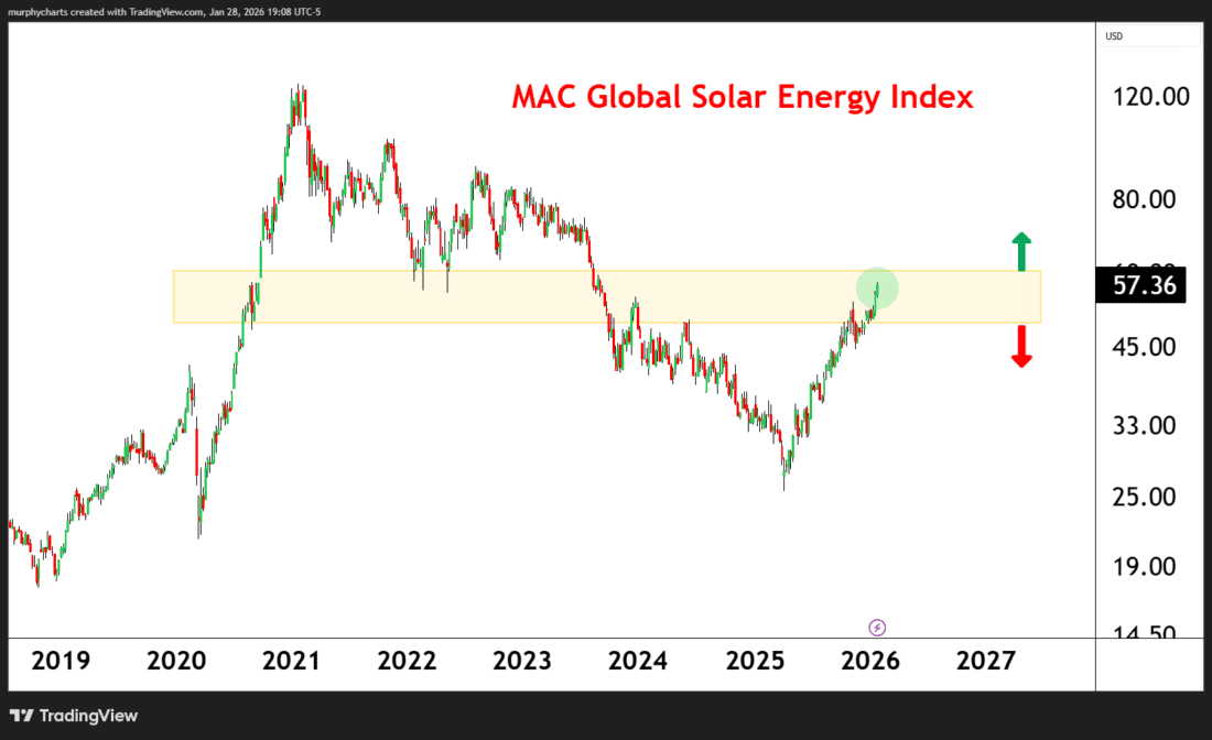 As a technician – I love defined price levels. They help us manage risk and push us to change our minds if proven wrong. The below Solar industry index is trading within a very defined price range. If you’re bullish on this industry – you’ll want to see the chart trade >60. Until that level is successfully breached, the path of least resistance is lower.