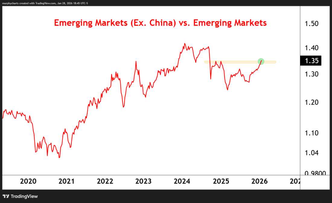 Emerging market stocks are making headlines this week – the asset class is printing new highs and benefiting from a declining US Dollar. When most people think of Emerging Markets, they think China – but it’s countries like India, South Korea, Peru, Greece, and South Africa that are the real outperformers. The below chart displays the price ratio of Emerging Markets Ex. China vs. Emerging Markets. The ratio printed new highs this week, breaking out from a yearlong basing pattern. It’s not just China that’s working – emerging economies of all sizes are participating in this rally!